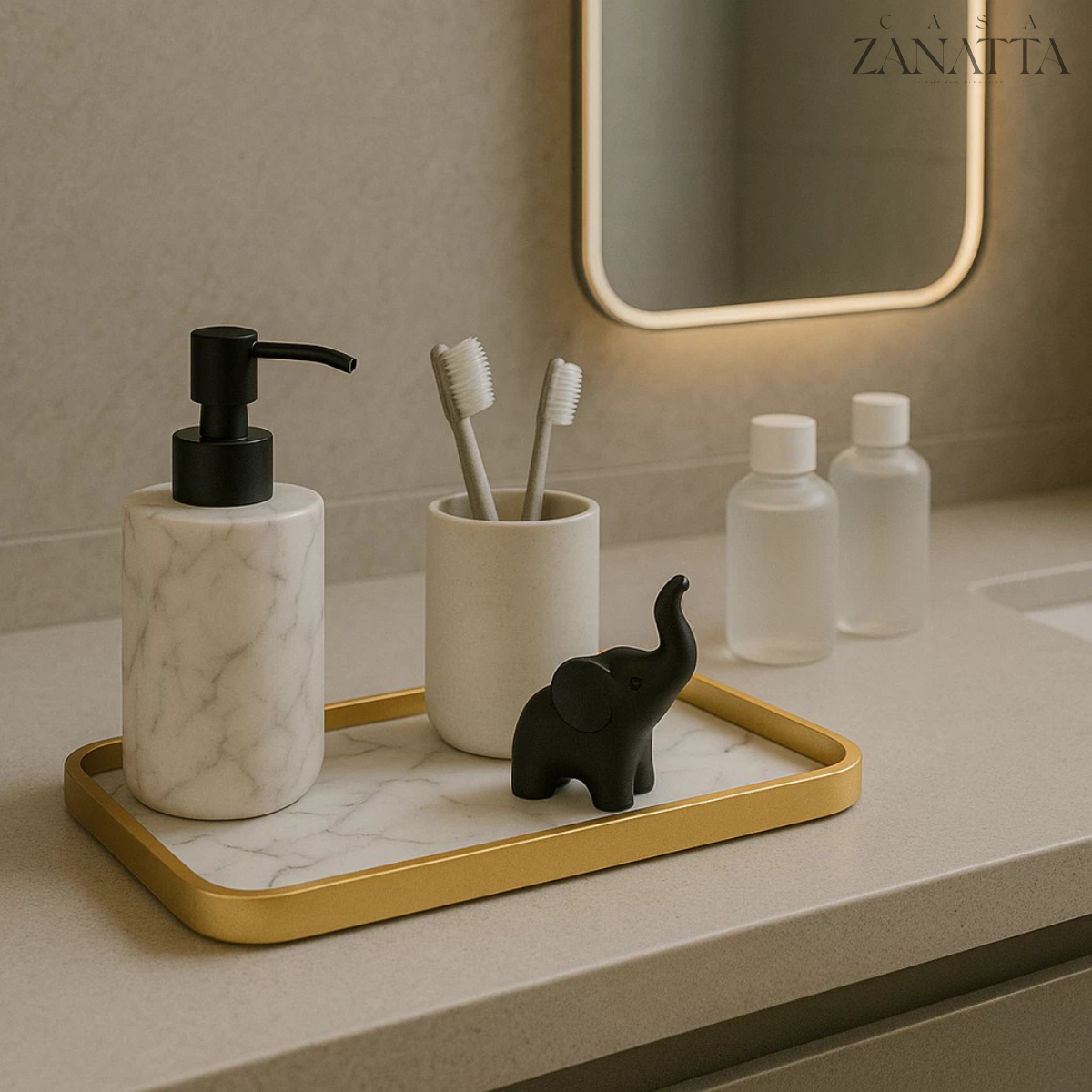 > "Exatamente o que eu precisava para organizar meus perfumes na penteadeira. Ficou um luxo! O mármore branco com dourado é lindo." – Juliana M.