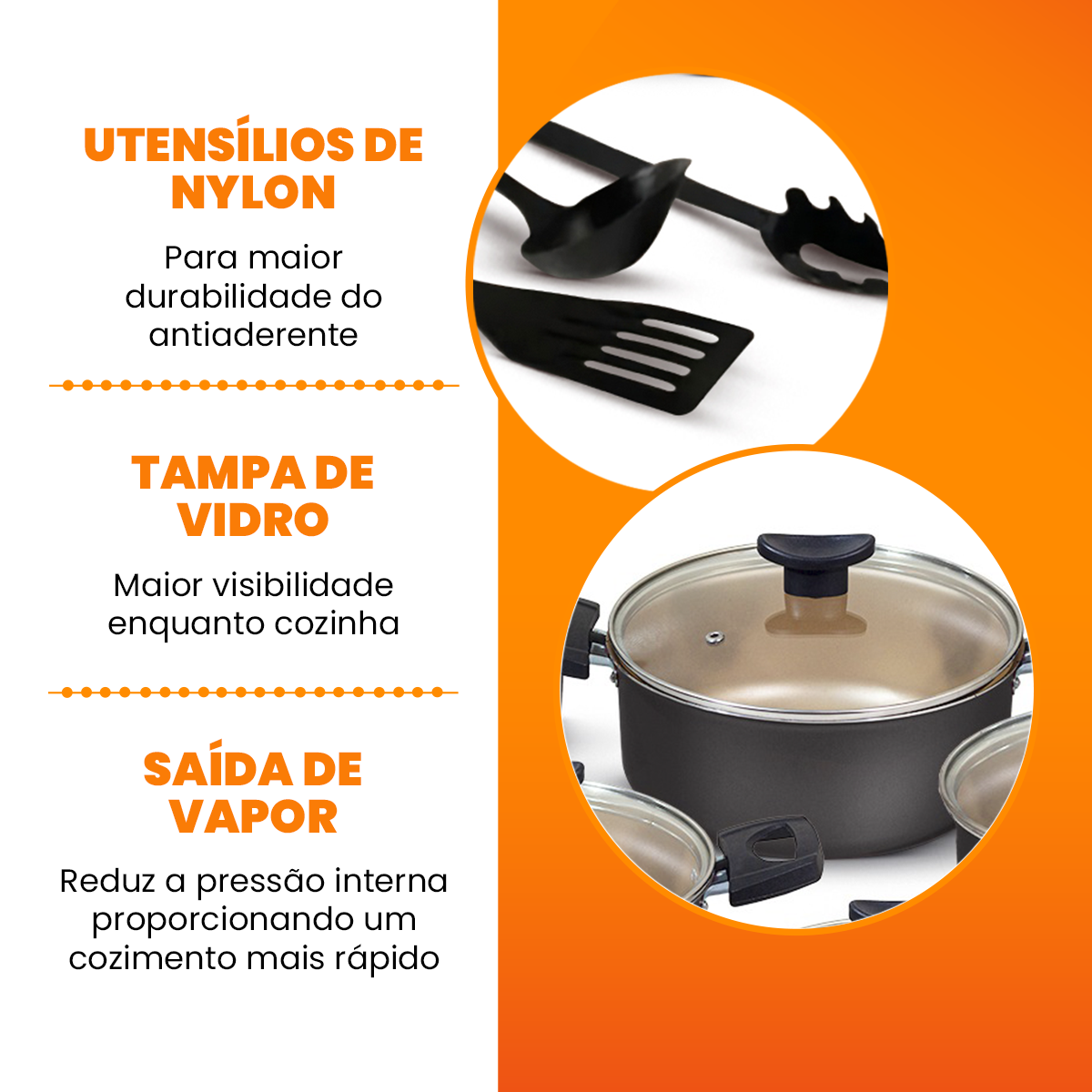 Todas as panelas possuem 5 camadas de revestimento antiaderente e espessura de 1,2 mm, proporcionando um cozimento uniforme e durabilidade. Tampas de vidro temperado com saída de vapor permitem visibilidade total durante o preparo das receitas. Pegadores em baquelite antitérmico oferecem segurança e conforto. Limpeza simplificada graças ao revestimento antiaderente de alta qualidade.