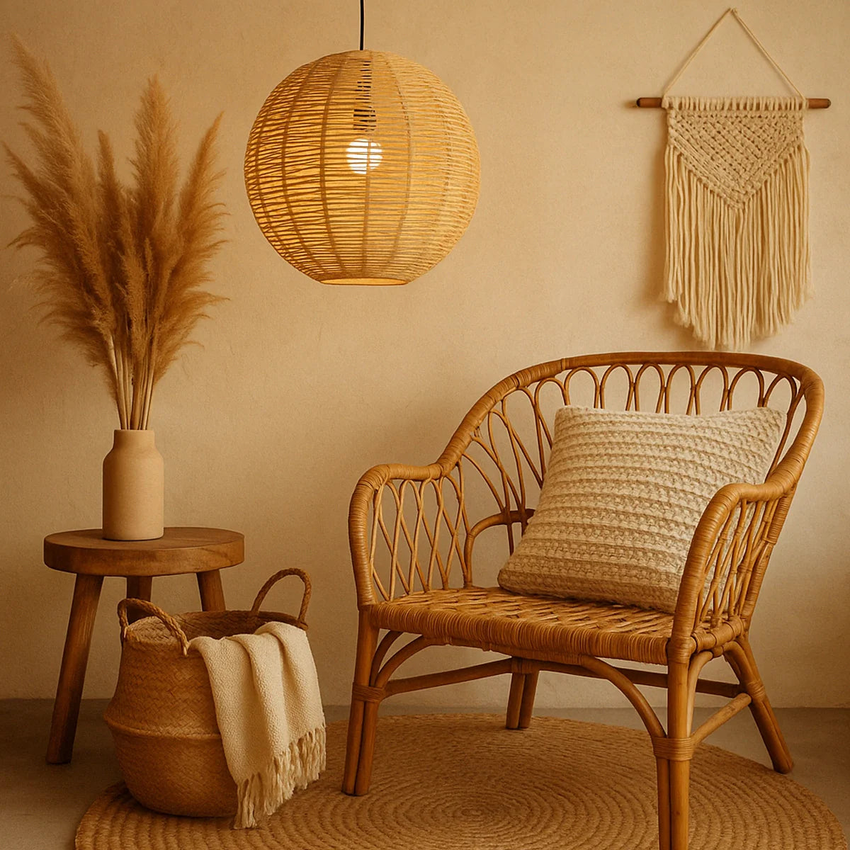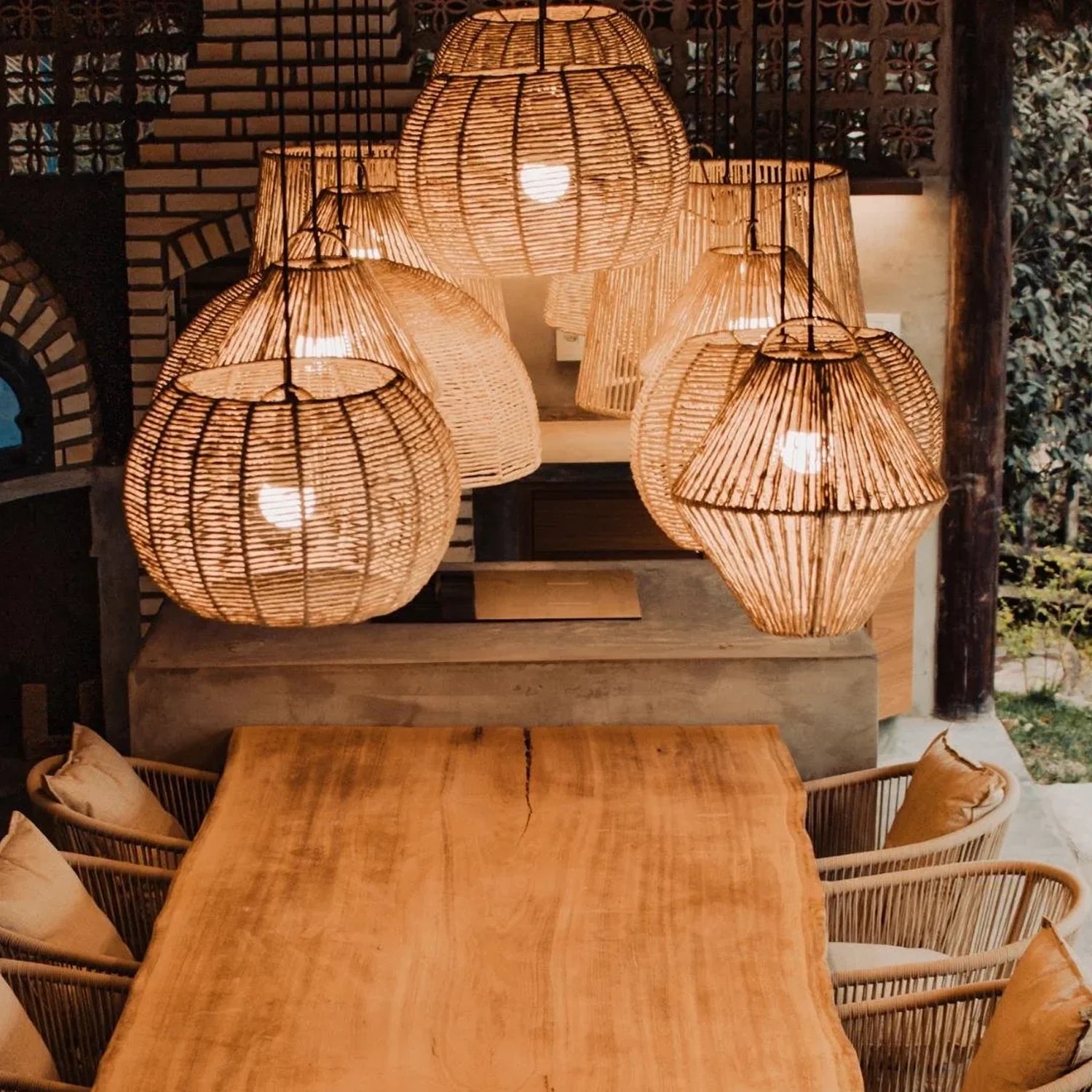 A Luminária Pendente de Palha Nawi possui uma estética artesanal e uma estrutura feita com fibra natural trançada. Seu visual leve e orgânico permite a passagem da luz de forma filtrada, criando uma atmosfera intimista e acolhedora no ambiente.