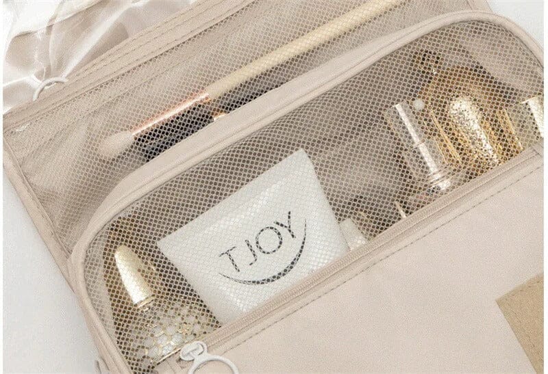 Grande Capacidade: Com diversos compartimentos internos e externos, acomoda itens grandes e pequenos com facilidade — ideal para produtos de higiene, cosméticos, maquiagem e acessórios de viagem.