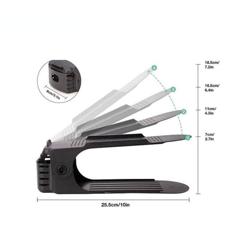 Altura Ajustável para Todos os Calçados: Diferente de outros suportes, nosso modelo possui regulagem de altura. Isso significa que ele acomoda perfeitamente desde sapatilhas e rasteirinhas até tênis de corrida e sapatos de salto alto, mantendo a forma original do calçado.