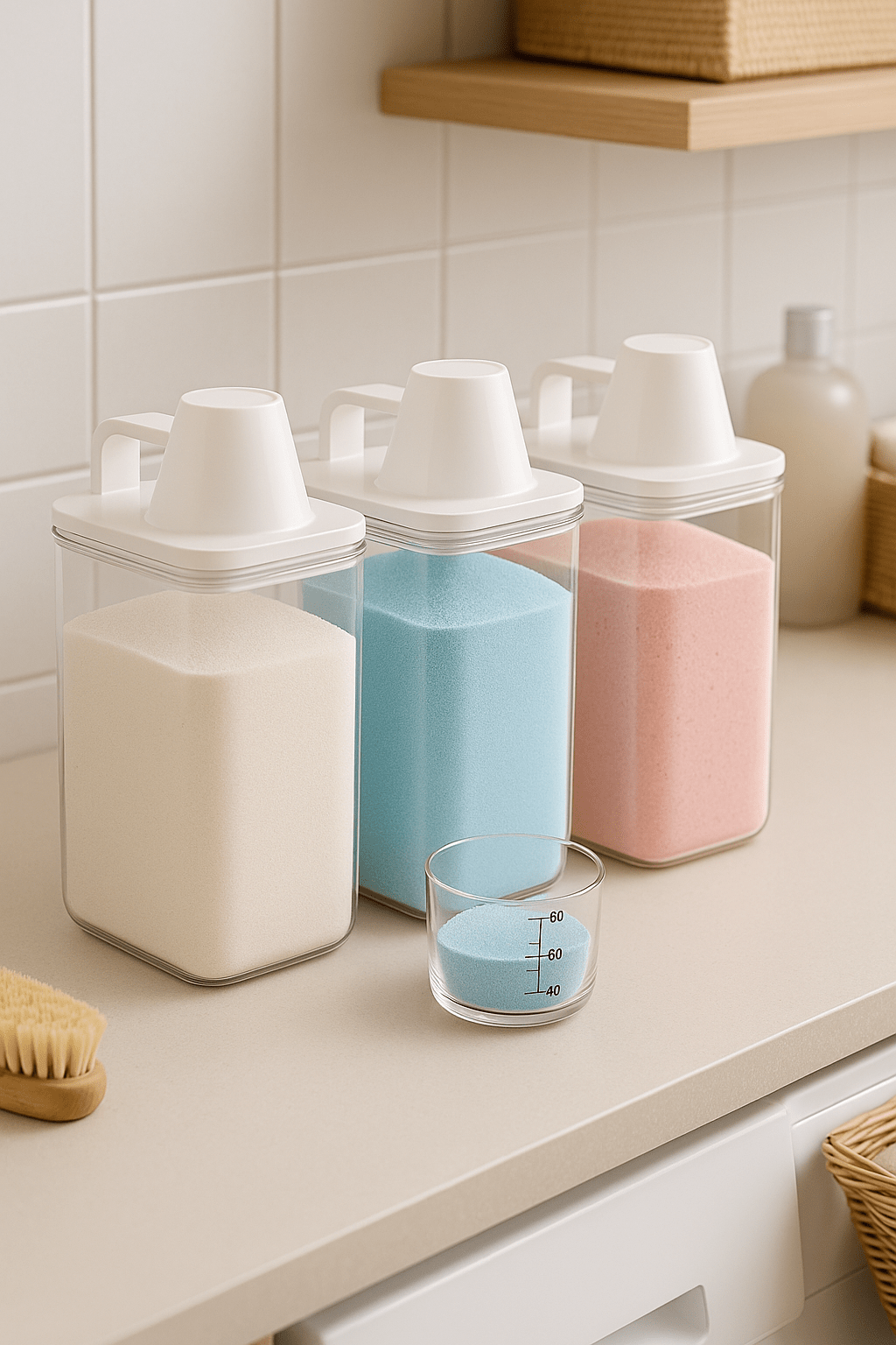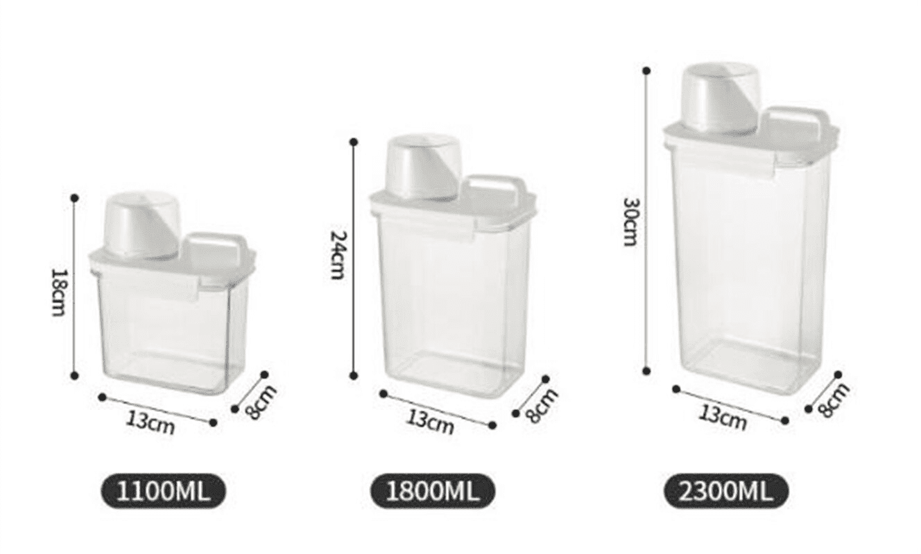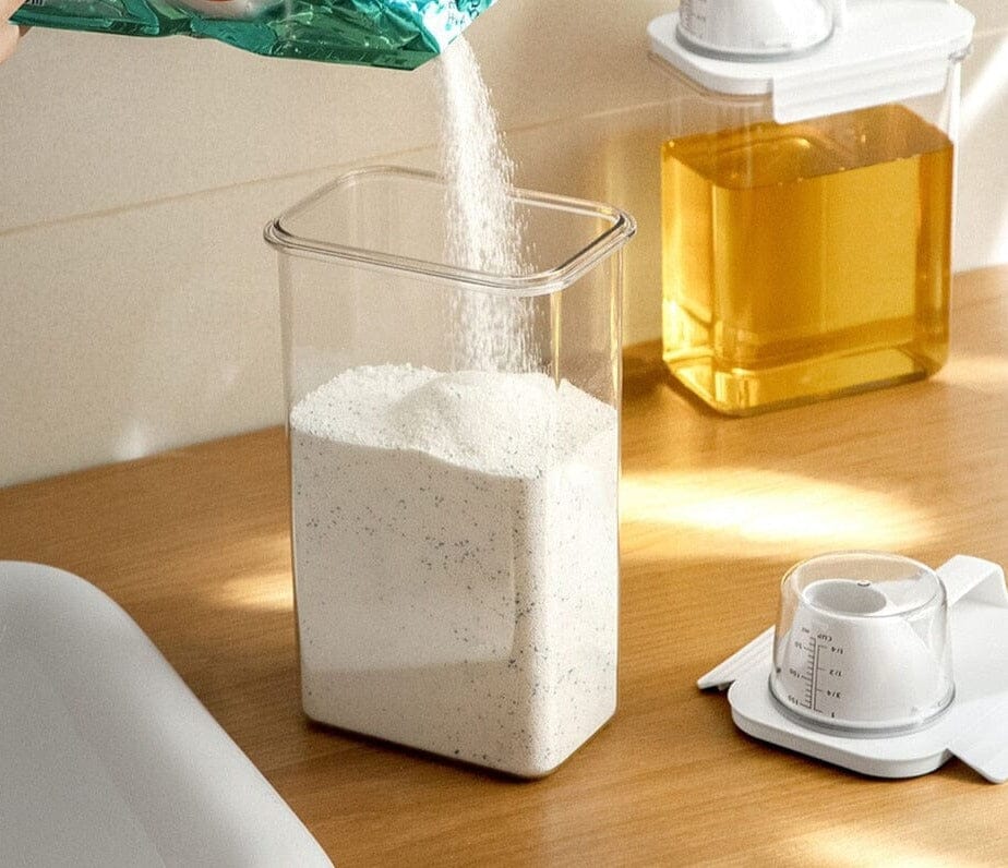 🧴 Na Lavanderia ✔️ Guarde seu sabão em pó com praticidade ✔️ Evite vazamentos e sujeira no armário ✔️ Dose certinha com o copo medidor ✔️ Diga adeus às embalagens feias e rasgadas ✔️ Protege contra umidade e insetos