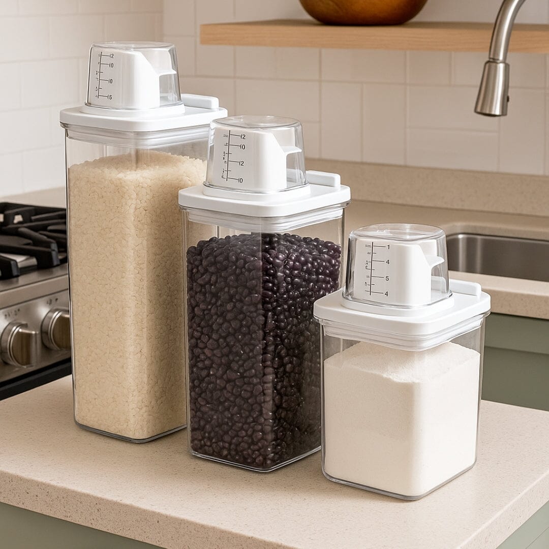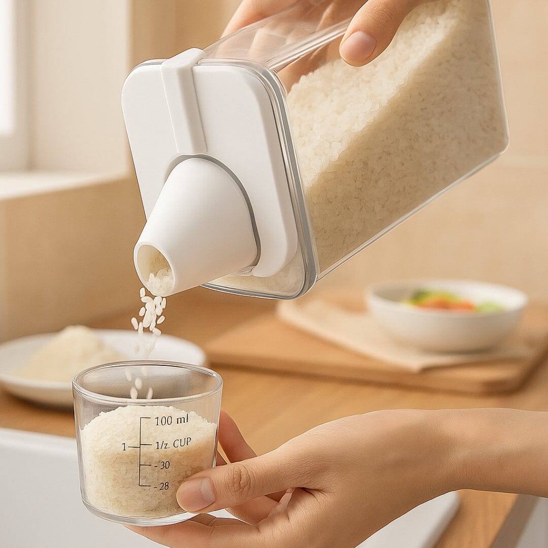 🍚 Na Cozinha ou Dispensa ✔️ Armazene arroz, feijão, açúcar ou grãos com segurança ✔️ Visual moderno e corpo transparente: veja o conteúdo com facilidade ✔️ Tampa com vedação dupla que mantém tudo fresco por mais tempo ✔️ Use o bico e o medidor para evitar desperdícios ✔️ Organização com toque de sofisticação